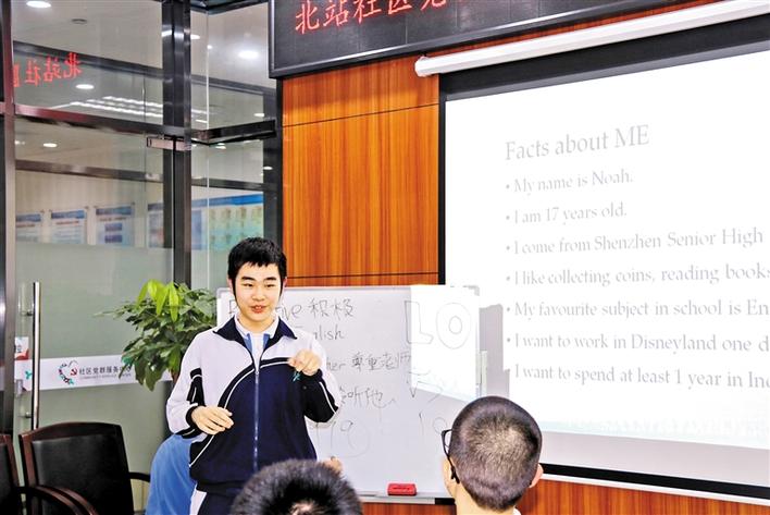 深圳高级中学的学生为北站社区公益辅导班的孩子讲课。