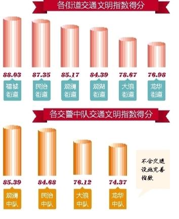 据悉,龙华区委宣传部(文明办)委托第三方机构,对各街道路口开展抽样调查,调查内容包括守法率指数、市民感受度指数、交通设施完善指数、人行道无障碍指数。从抽样路口交通文明指数得分情况来看,观澜街道桂香路观光路路口(观澜方向)、福城桂香路观光路路口(福城方向)、民治街道留仙大道民塘路路口分列前三名,龙华街道梅龙路东环二路路口、大浪街道和平路龙胜路路口、龙华街道龙观大道东环一路路口列末三位。从各街道交通文明指数得分来看,福城街道纳入测评的路口平均得分较高,为88.03分,其次是民治街道87.35分、观澜街道85.17分、观湖街道84.39分、大浪街道78.67分、龙华街道76.98分。从各交警中队交通文明指数得分(不含交通设施完善指数)来看,观澜中队85.39分、民治中队84.68分、大浪中队76.12分、龙华中队74.37分。