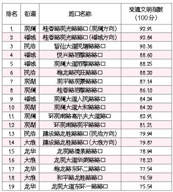 本报讯(龙华新闻记者 王雪敏)让龙华人出行更顺畅,让龙华交通环境更文明。近日,龙华区委宣传部(文明办)发布2019年第一季度龙华区交通文明指数调查报告,通过对19个样本路口(其中有2个路口分别是两个街道交会路口)的调查,全区总分为83.56分,观澜街道桂香路观光路路口(观澜方向)、福城桂香路观光路路口(福城方向)、民治街道留仙大道民塘路路口分列前三名。