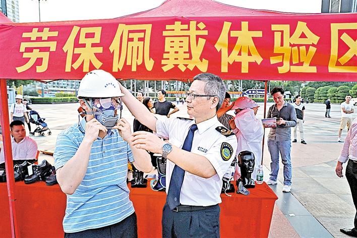 市民在工作人员的指导下进行劳保用品佩戴体验。