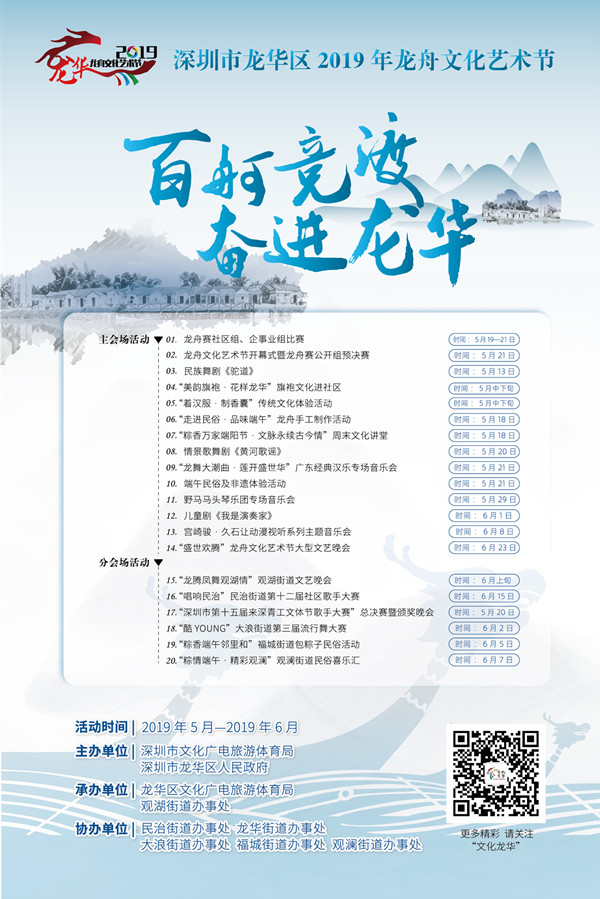 深圳新闻网5月15日讯(记者 杨维易 通讯员 刘柳君 曾宇宁)为全面贯彻落实党的十九大精神,聚焦新中国成立70周年、深圳建市40周年,传承优秀传统文化,弘扬社会主义核心价值观,实施“文化强区”战略,建设“人文龙华”,丰富市民群众文化生活,龙华区将于5月19日至6月30日举行2019年龙舟文化艺术节活动。本次活动由深圳市文化广电旅游体育局、龙华区人民政府共同主办,龙华区文化广电旅游体育局及龙华区观湖街道办事处承办。