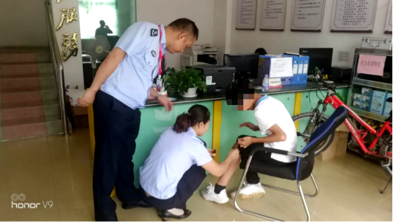 当天清晨,随着雨越下越大,道路也越来越模糊,桔塘社区值班网格员正在辖区开展暴雨安全隐患巡查工作,忽见一骑行的男孩从一个小坡道上直冲而下,摔倒在地。正在一旁开展工作的五名网格员赶紧上前扶起男孩,查看他的伤势情况,并把男孩带到办公室进行简单的医疗救护;同时叮嘱男孩以后骑单车时要注意安全,遇到上下陡陂时要下车推行。经询问,得知男孩住在荣辉花园,网格员第一时间与他的父母取得了联系,由于男孩的父母不认识网格办公室的路,网格员专程开车将男孩安全护送到家。