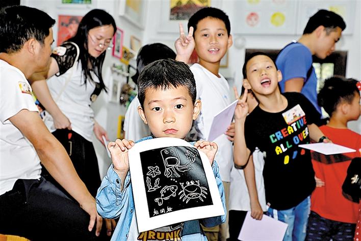 活动当天,亲子们了解了版画的发展历史和艺术特点,认识版画的创作过程,并展开想象开展版画创作。在制作环节,小朋友们迫不及待地来到涂鸦板前,和家长一起完成主题涂鸦。红旗飘扬、神舟翱翔、烟花绽放、孩童欢跳……小朋友们将用心完成的作品和最美好的祝愿献给祖国妈妈。