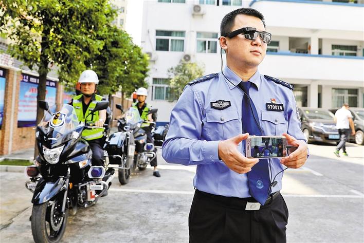 深圳市公安局宝安分局的警官展示“AR眼镜+执法记录仪”。