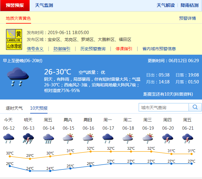 深圳新闻网2019年6月12日讯 10日下班高峰期的一场狂风暴雨横扫深圳,不禁有网友疑惑,这难道是台风吗?这当然不是台风,它是强对流天气伴随的短时大风,最大阵风有时甚至和台风不相上下,虽然阵风强,但强对流大风的持续时间较短;“一秒天黑”的深圳,11日下班时段又有一场强雷雨横扫,预计12、13日降雨仍频密。