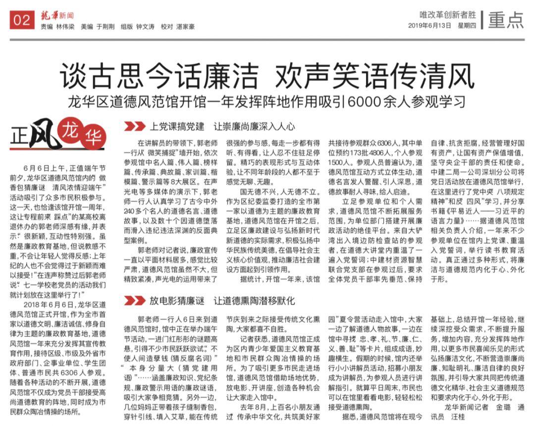 2018年6月6日,龙华区道德风范馆正式开馆,作为全市首家以道德文明、廉洁诚信、修身自律为主题的廉政教育基地,道德风范馆一年来充分发挥其宣传教育作用,接待区级、市级及外省市政府部门、企事业单位、学生团体、普通市民共6306人参观。随着各种活动的不断开展,道德风范馆不仅成为党员干部接受高尚道德教育的阵地,同时成为市民群众陶冶情操的场所。