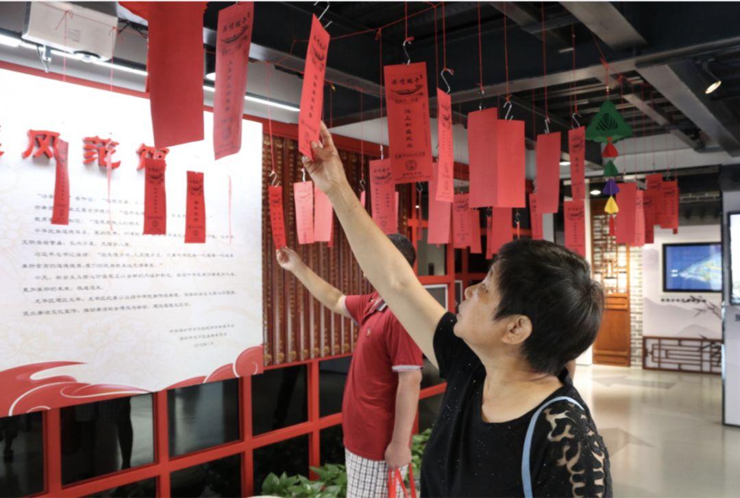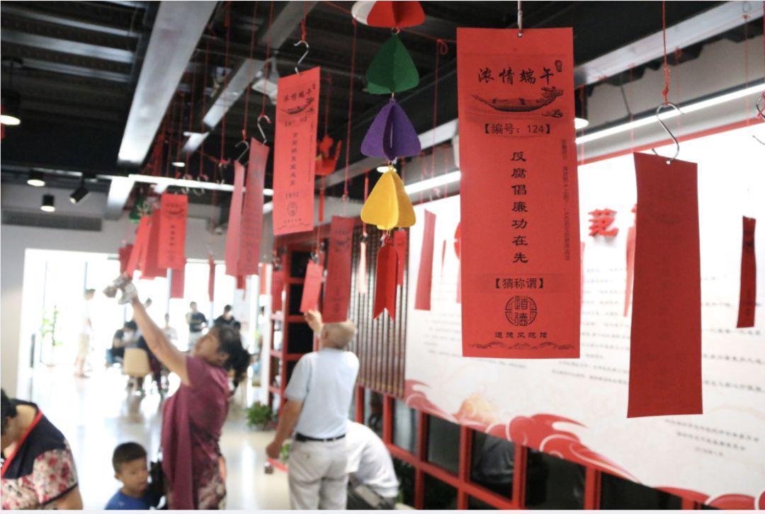 郭老师一行人6日来到道德风范馆时,馆中正在举办端午节活动,一进门红彤彤的谜题高悬,引得不少市民跃跃欲试。“不使人间造孽钱(猜反腐名词)”“本身分量大(猜党建用语)”……涵盖廉政知识、党纪条规、廉政警示用语的廉政谜语,吸引大家争相竞猜。另外一边,几位妈妈正带着孩子缝制香包,穿针引线、填入艾草,能在传统节庆到来之际接受传统文化熏陶,大家都喜不自胜。