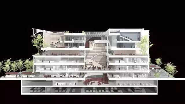 利用各层平面有大小不同、形式的退台和露台空间,并能与立面造型产生互动的特点,把周边的绿化带到建筑之内,使得建筑内部各空间都能拥有不同的大自然体验。