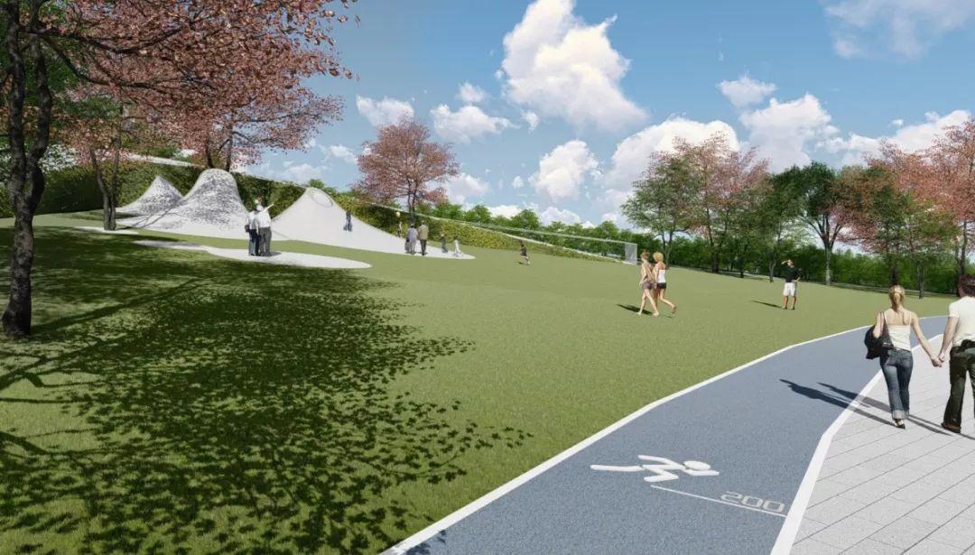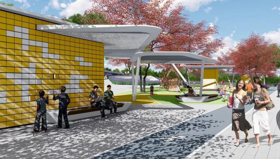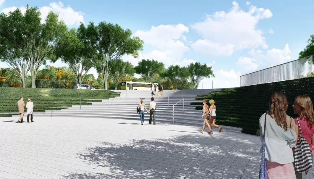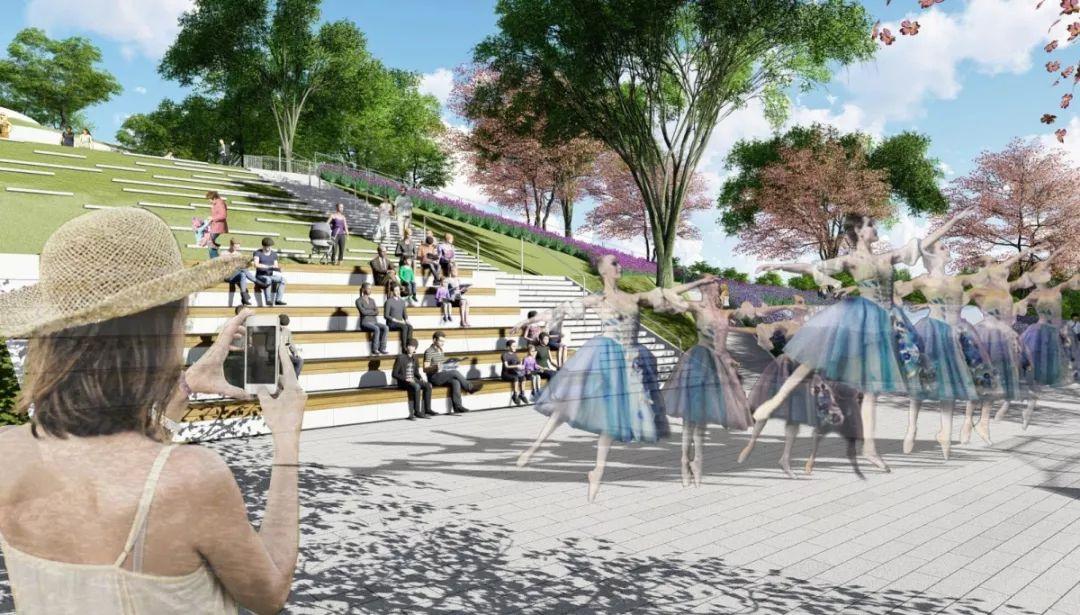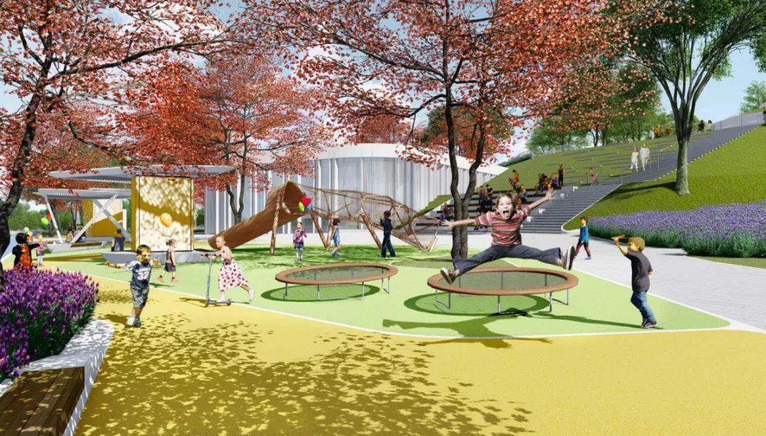 在公园的边界与内部设置坡道、楼梯、连桥与周边联动,打造体验丰富的片区公共空间体系及慢行系统。