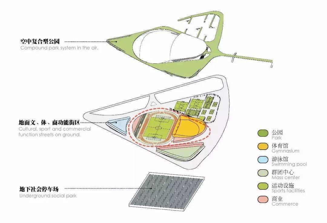 空中公园内围绕运动场的上空自然形成环形主动线。公园内绿植茂盛,通过植入多类型建筑景观空间元素,引发多种类型的活动体验:观景、慢跑、骑行、休闲、聚会、观看比赛、小型表演、体验农场、周末市集等等。