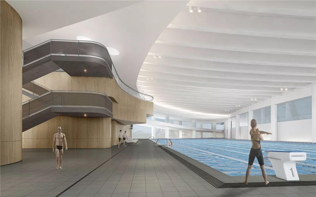 由标准泳池、训练池及戏水池组成,共2层。