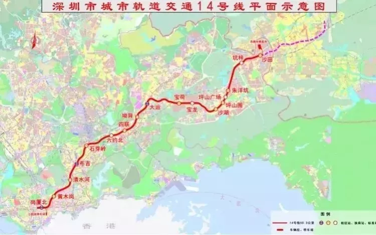 17个站点分别为:岗厦北站、黄木岗站、清水河站、布吉站、石芽岭站、六约北站、四联站、坳背站、大运站、宝荷站、宝龙站、沙湖站、坪山围站、坪山广场站、朱洋坑站、坑梓站、沙田站。