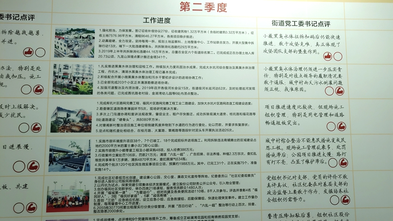 5月起,福城街道和机关、社区各基层党组织均分级设立战绩榜、光荣榜、点评榜,每季度展示近60个党支部的工作进展,评选公示党员先锋和岗位标兵,点评实际表现。每季度由党组织书记分别在战绩榜和点评榜上点评支部工作情况和党员工作表现、政治表现,引导党组织书记公平公道作点评、旗帜鲜明表态度、扛起责任抓队伍。点评中特别是对贯彻执行街道党工委决策部署情况、理想信念、党员意识和组织观念等政治表现进行评价,推动党组织带头人严格按照战斗堡垒和先锋标准对下属支部和党员进行考核和管理。对表现优异的支部或个人点赞表扬,对表现欠佳的,一针见血指出不足,敢于揭短亮丑,接受群众监督和评判。点评内容辣味十足,让党员干部“红脸、出汗”,“较真”的评议,倒逼党员干部争相学习先进、敢于担当作为。辖区居民从一面面红色的榜上,切实感受到街道党工委、基层党组织狠抓党员队伍建设的认真务实态度,增强群众听党话、跟党走的信心。