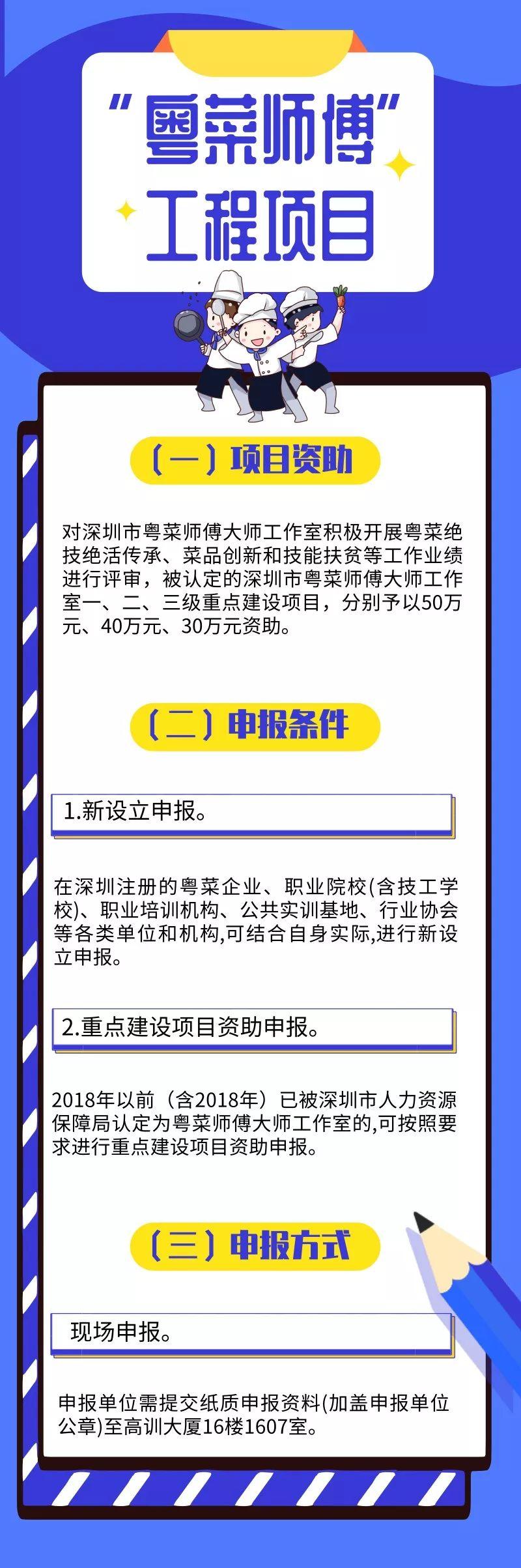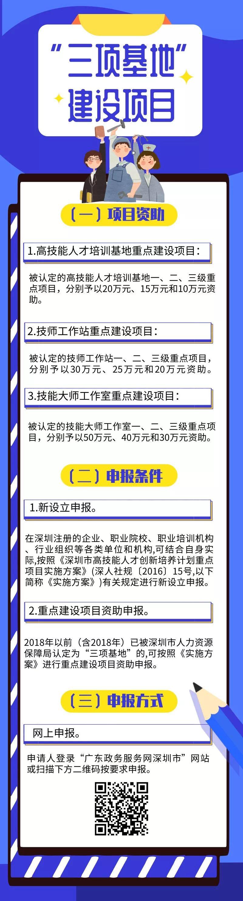 为有效破解深圳技工短缺的难题,加快高技能人才队伍建设,助推产业结构转型升级和新兴战略性产业发展,培养造就一批具有精湛技艺的高技能人才,深圳重点实施高技能人才培训基地、技师工作站、技能大师工作室(简称“三项基地”建设项目)和粤菜师傅高技能人才培训基地、粤菜师傅大师工作室(简称“粤菜师傅”工程项目)相关项目。