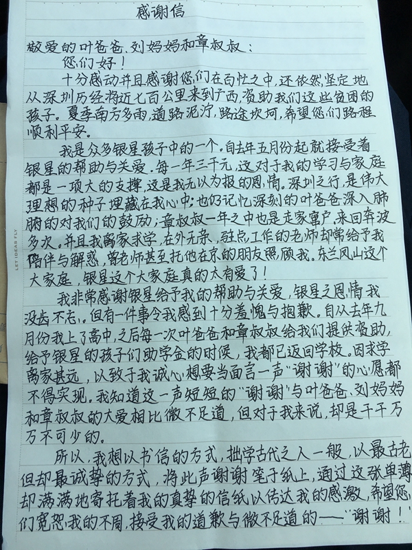 写信的这位“银星之子”是银星集团2018年5月份开始资助学生,名叫谭小凤,去年初三毕业考入北京中央民族大学附属中学,高一十二班(下学期分班)。