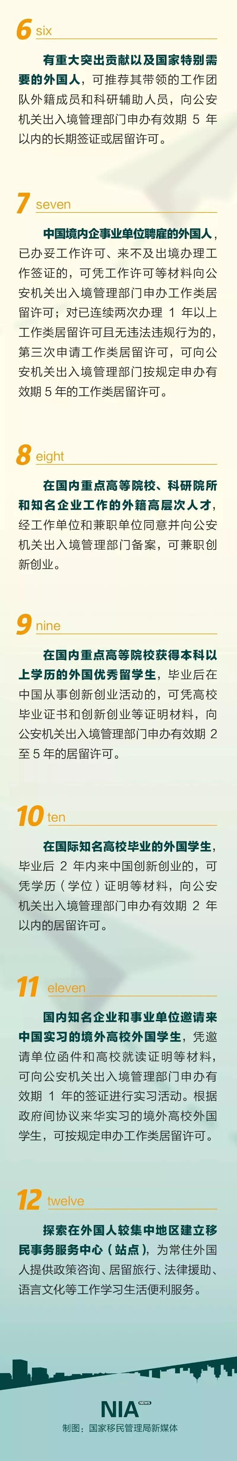 此次政策措施进行了创新改进、优化整合,将其中鼓励、支持、便利外籍人才、外国优秀青年和外籍华人来华在华创新创业、投资兴业、学习工作的12条移民与出入境政策推广复制,于2019年8月1日起在全国范围内实施。