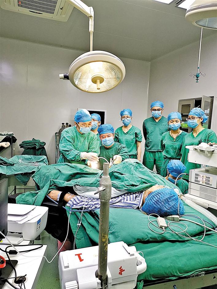冷有旭(前左二)在手术台上手把手指导当地年轻医生。
