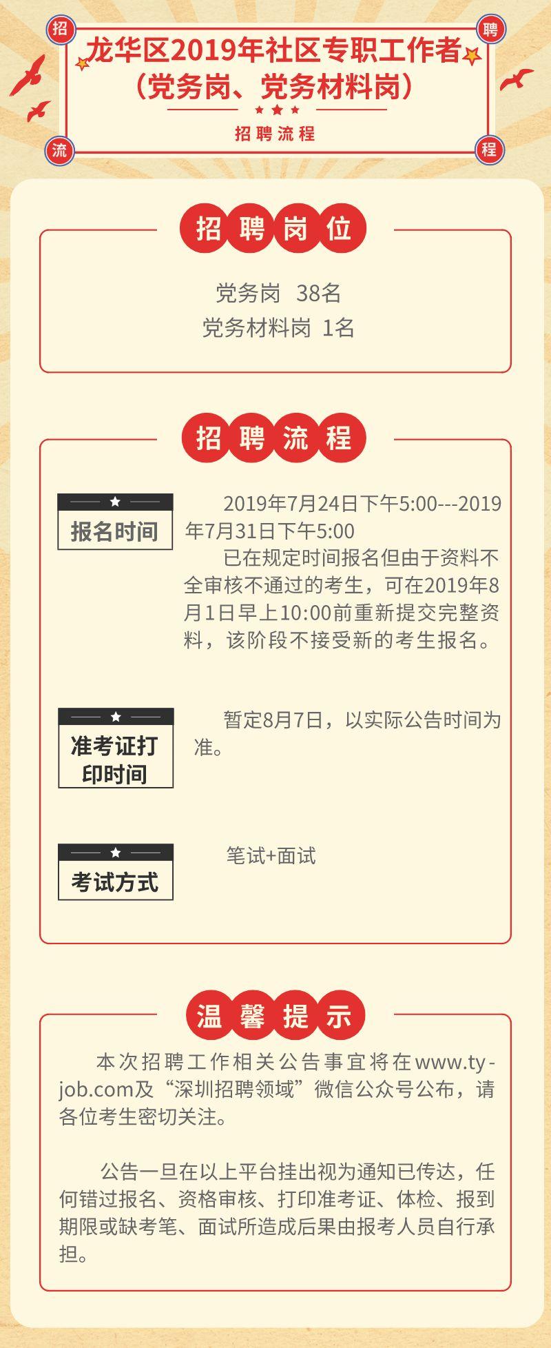 本次共招聘39人,岗位要求见《龙华区2019年社区专职工作者(党务岗、党务材料岗)招聘岗位表》。