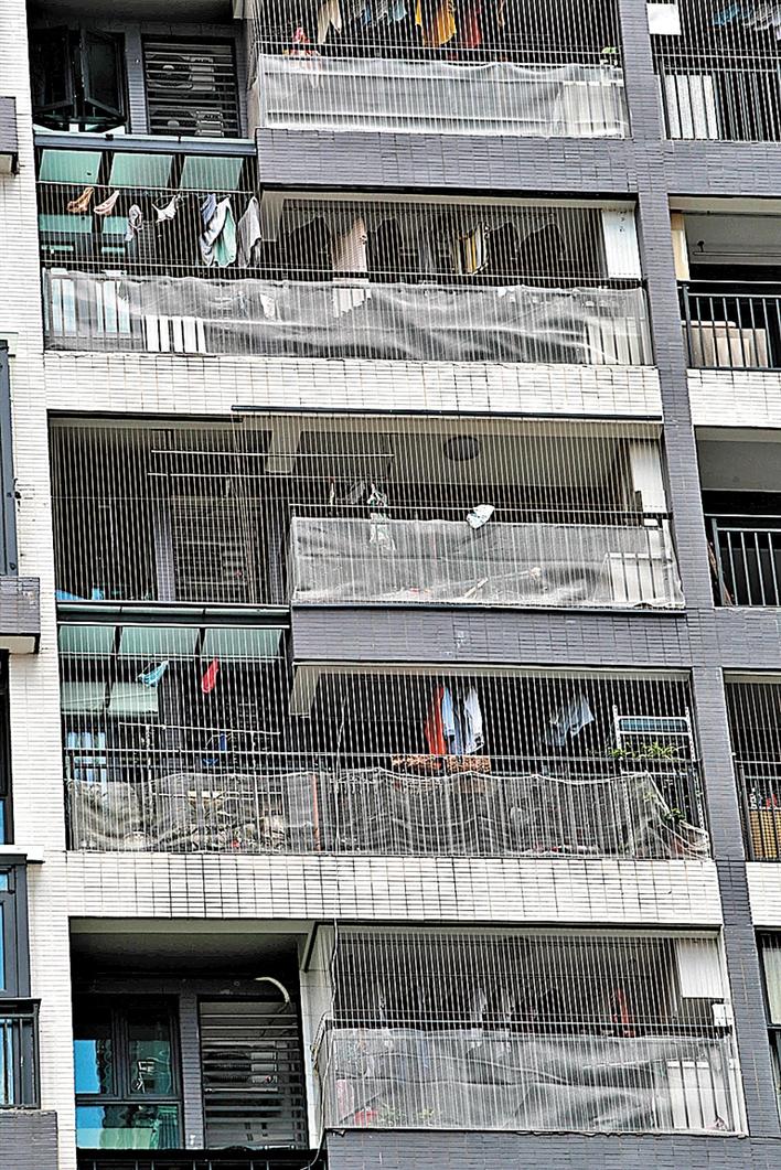 小区居民自发在阳台外安装预防高空物件坠落防护网。