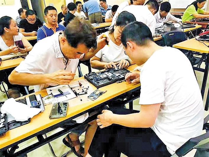 民乐社区困难群众再就业帮扶行动现场,居民学维修电器。