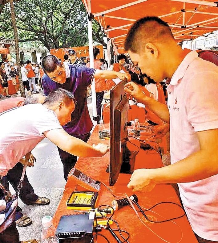 龙华新闻讯(记者 王雪敏 通讯员 赵冬梅/文 记者 蔡维泽/图)为进一步延伸服务触角,提升服务水平,打造“功能化、标准化、特色化”的社区党群服务中心,实现“一社区一特色”建设目标。8月10日,民乐社区党群服务中心在民治街道党群服务中心的指导下和民乐社区党委的支持下,在民乐社区公园开展“党民连心‘家’年华”为主题的民乐社区“特色服务月”活动。活动中就有不久前刚在社区公益电子培训班学有所成的居民来摆摊,为邻里街坊免费维修家电。