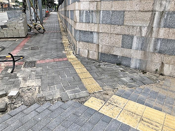 在龙华人民路边的人行道上,除了多处盲道存在“断裂”,该路段盲道紧邻该小区围墙铺建,行人几乎无法在其上行走,形同虚设。