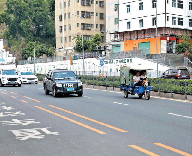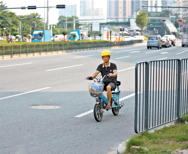 观澜人民路有轨电车沿线设置了非机动车道,但仍有市民骑电动三轮车走机动车道。
