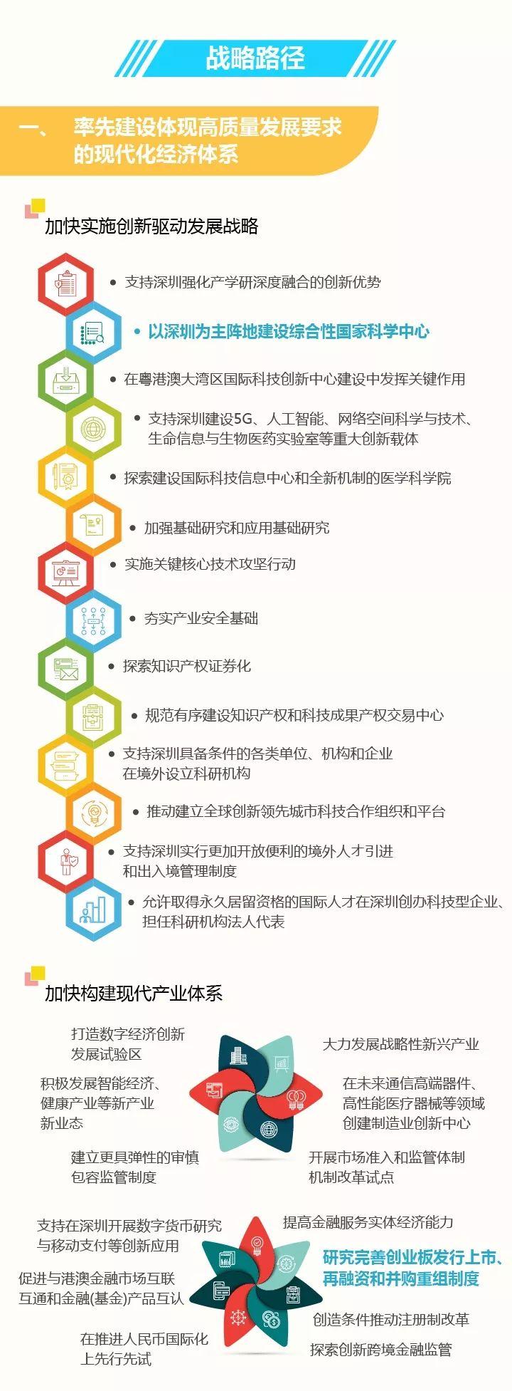(一)指导思想。以习近平新时代中国特色社会主义思想为指导,全面贯彻党的十九大和十九届二中、三中全会精神,紧紧围绕统筹推进“五位一体”总体布局和协调推进“四个全面”战略布局,坚持和加强党的全面领导,坚持新发展理念,坚持以供给侧结构性改革为主线,坚持全面深化改革,坚持全面扩大开放,坚持以人民为中心,践行高质量发展要求,深入实施创新驱动发展战略,抓住粤港澳大湾区建设重要机遇,增强核心引擎功能,朝着建设中国特色社会主义先行示范区的方向前行,努力创建社会主义现代化强国的城市范例。 (二)战略定位 ——高质量发展高地。深化供给侧结构性改革,实施创新驱动发展战略,建设现代化经济体系,在构建高质量发展的体制机制上走在全国前列。 ——法治城市示范。全面提升法治建设水平,用法治规范政府和市场边界,营造稳定公平透明、可预期的国际一流法治化营商环境。 ——城市文明典范。践行社会主义核心价值观,构建高水平的公共文化服务体系和现代文化产业体系,成为新时代举旗帜、聚民心、育新人、兴文化、展形象的引领者。 ——民生幸福标杆。构建优质均衡的公共服务体系,建成全覆盖可持续的社会保障体系,实现幼有善育、学有优教、劳有厚得、病有良医、老有颐养、住有宜居、弱有众扶。 ——可持续发展先锋。牢固树立和践行绿水青山就是金山银山的理念,打造安全高效的生产空间、舒适宜居的生活空间、碧水蓝天的生态空间,在美丽湾区建设中走在前列,为落实联合国2030年可持续发展议程提供中国经验。 (三)发展目标。到2025年,深圳经济实力、发展质量跻身全球城市前列,研发投入强度、产业创新能力世界一流,文化软实力大幅提升,公共服务水平和生态环境质量达到国际先进水平,建成现代化国际化创新型城市。到2035年,深圳高质量发展成为全国典范,城市综合经济竞争力世界领先,建成具有全球影响力的创新创业创意之都,成为我国建设社会主义现代化强国的城市范例。到本世纪中叶,深圳以更加昂扬的姿态屹立于世界先进城市之林,成为竞争力、创新力、影响力卓著的全球标杆城市。 二、率先建设体现高质量发展要求的现代化经济体系 (四)加快实施创新驱动发展战略。支持深圳强化产学研深度融合的创新优势,以深圳为主阵地建设综合性国家科学中心,在粤港澳大湾区国际科技创新中心建设中发挥关键作用。支持深圳建设5G、人工智能、网络空间科学与技术、生命信息与生物医药实验室等重大创新载体,探索建设国际科技信息中心和全新机制的医学科学院。加强基础研究和应用基础研究,实施关键核心技术攻坚行动,夯实产业安全基础。探索知识产权证券化,规范有序建设知识产权和科技成果产权交易中心。支持深圳具备条件的各类单位、机构和企业在境外设立科研机构,推动建立全球创新领先城市科技合作组织和平台。支持深圳实行更加开放便利的境外人才引进和出入境管理制度,允许取得永久居留资格的国际人才在深圳创办科技型企业、担任科研机构法人代表。 (五)加快构建现代产业体系。大力发展战略性新兴产业,在未来通信高端器件、高性能医疗器械等领域创建制造业创新中心。开展市场准入和监管体制机制改革试点,建立更具弹性的审慎包容监管制度,积极发展智能经济、健康产业等新产业新业态,打造数字经济创新发展试验区。提高金融服务实体经济能力,研究完善创业板发行上市、再融资和并购重组制度,创造条件推动注册制改革。支持在深圳开展数字货币研究与移动支付等创新应用。促进与港澳金融市场互联互通和金融(基金)产品互认。在推进人民币国际化上先行先试,探索创新跨境金融监管。 (六)加快形成全面深化改革开放新格局。坚持社会主义市场经济改革方向,探索完善产权制度,依法有效保护各种所有制经济组织和公民财产权。支持深圳开展区域性国资国企综合改革试验。高标准高质量建设自由贸易试验区,加快构建与国际接轨的开放型经济新体制。支持深圳试点深化外汇管理改革。推动更多国际组织和机构落户深圳。支持深圳举办国际大型体育赛事和文化交流活动,建设国家队训练基地,承办重大主场外交活动。支持深圳加快建设全球海洋中心城市,按程序组建海洋大学和国家深海科考中心,探索设立国际海洋开发银行。 (七)助推粤港澳大湾区建设。进一步深化前海深港现代服务业合作区改革开放,以制度创新为核心,不断提升对港澳开放水平。加快深港科技创新合作区建设,探索协同开发模式,创新科技管理机制,促进人员、资金、技术和信息等要素高效便捷流动。推进深莞惠联动发展,促进珠江口东西两岸融合互动,创新完善、探索推广深汕特别合作区管理体制机制。 三、率先营造彰显公平正义的民主法治环境 (八)全面提升民主法治建设水平。在党的领导下扩大人民有序政治参与,坚持和完善人民代表大会制度,加强社会主义协商民主制度建设。用足用好经济特区立法权,在遵循宪法和法律、行政法规基本原则前提下,允许深圳立足改革创新实践需要,根据授权对法律、行政法规、地方性法规作变通规定。加强法治政府建设,完善重大行政决策程序制度,提升政府依法行政能力。加大全面普法力度,营造尊法学法守法用法的社会风尚。 (九)优化政府管理和