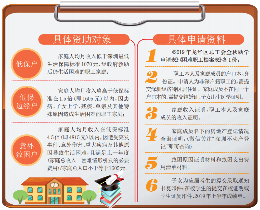 据介绍,龙华区总工会“金秋助学”活动资助对象为本区已建工会的企事业机关单位或社区工联会覆盖的单位困难职工,其子女应届考上或在读,经各级教育主管部门批准备案列入招生计划的全日制大中专院校和普通高中、职业高中。具体分为三类:低保户。家庭人均月收入低于深圳最低生活保障标准1070元,经政府救助后仍生活困难的职工家庭;低保边缘户。家庭人均月收入略高于低保标准在1.5倍(即1605元)以内,因患病、子女上学、残疾、单亲及其他特殊原因造成生活困难的职工家庭;意外致困户。家庭人均月收入在低保标准4.5倍(即4815元)以内,因遭受突发事件、意外伤害、重大疾病及其他原因导致生活困难,且满足上一年度(家庭总收入-困难情形引发的必要费用)/家庭总人口小于等于1605元。
