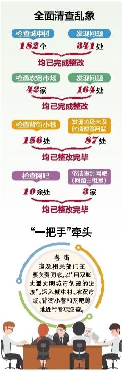 目前,全区共检查城中村182个,发现问题341处,均已完成整改;检查农贸市场42家,发现问题164处,均整改完毕,在农贸市场张贴市民公约、诚信经营等宣传广告480余份;检查背街小巷156处,发现垃圾未及时清理等问题87处,均已整改完毕;检查网吧10余处,依法查封网吧(网络出租屋)3家。