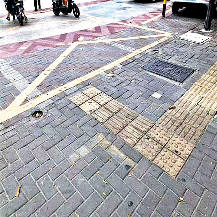 在沿河路,原本被路牌柱截断的盲道调整为沿着路牌柱子向前,该处盲道被基础设施占用的问题已被解决。