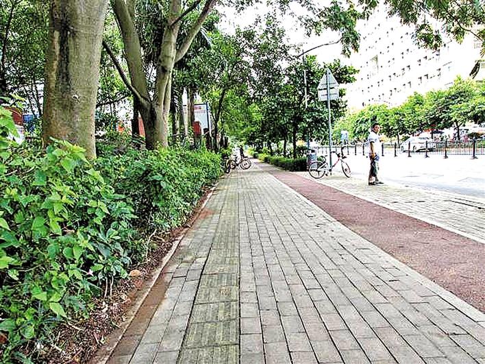 在清湖文化产业园附近,长满青苔、杂草丛生的盲道已得到清理,曾堆放在该路段盲道上的几十辆共享单车也完成了清运,盲道整体整洁畅通。
