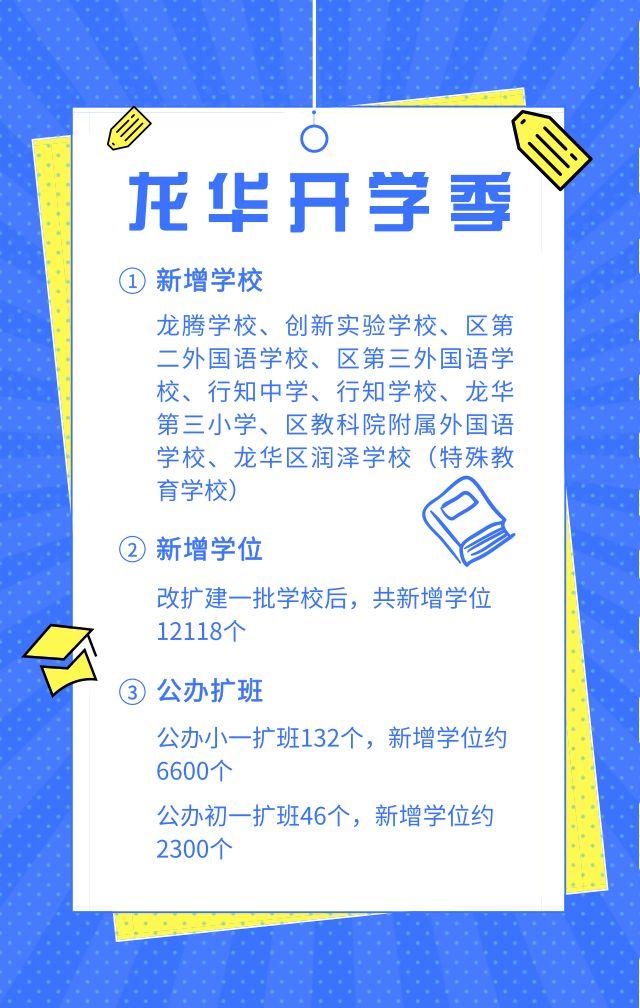 今年新增的龙腾学校、创新实验学校、区第二外国语学校、区第三外国语学校、行知中学、行知学校、龙华第三小学、区教科院附属外国语学校、龙华区润泽学校(特殊教育学校)9所义务教育阶段学校如期开学。新改扩建一批学校后,共新增学位12118个。据了解,今年,符合龙华区学位申请条件人数为36889人,较去年增加5991人,同比增长近20%。为此,龙华区通过提前开办学校、扩班等方式缓解学位压力,继续加大教育资源供给。新学期,龙华区公办小一扩班132个,新增学位约6600个;公办初一扩班46个,新增学位约2300个。