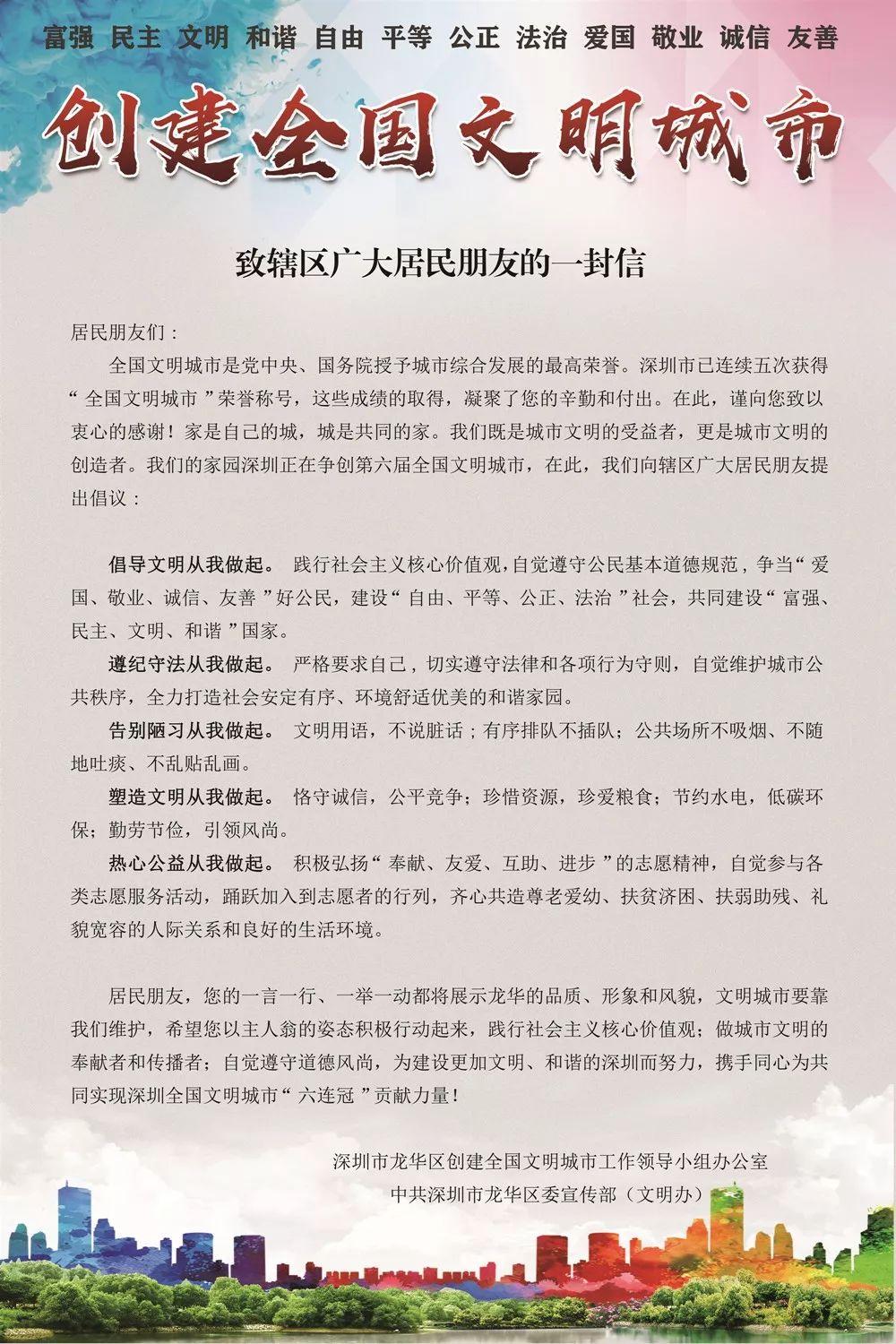 全国文明城市是党中央、国务院授予城市综合发展的最高荣誉。深圳市已连续五次获得“全国文明城市”荣誉称号,这些成绩的取得,凝聚了您的辛勤和付出。在此,谨向您致以衷心的感谢!家是自己的城,城是共同的家。我们既是城市文明的受益者,更是城市文明的创造者。我们的家园深圳正在争创第六届全国文明城市,在此,我们向辖区广大居民朋友提出倡议:
