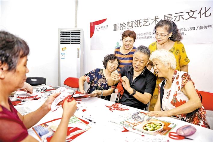 点评 在沙元埔社区剪纸班,吴自力点评学员的剪纸作品,并指导如何完善作品。