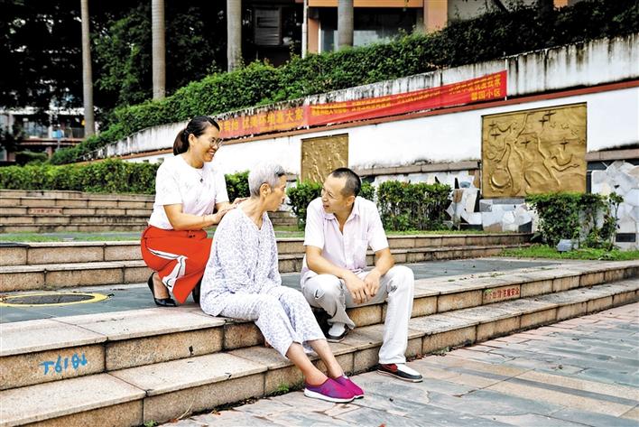 在民治馨园小区的蘑菇亭广场,过往居民总会看到一对夫妇陪着一个老人在晒太阳,老人穿得清爽得体,脸上没有太多表情。女人的手一直没闲下来,在帮老人按摩手脚,不时还蹲在老人身后,稳住老人的身体。男人则在一旁和老人讲话,有时会拿起手机拍拍老人的照片,有时会伸脚驱赶老人脚下的蚂蚁。