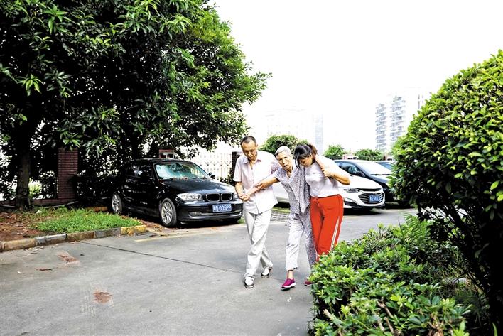 廖良勇和黄金晖搀扶着母亲在小区里散步。