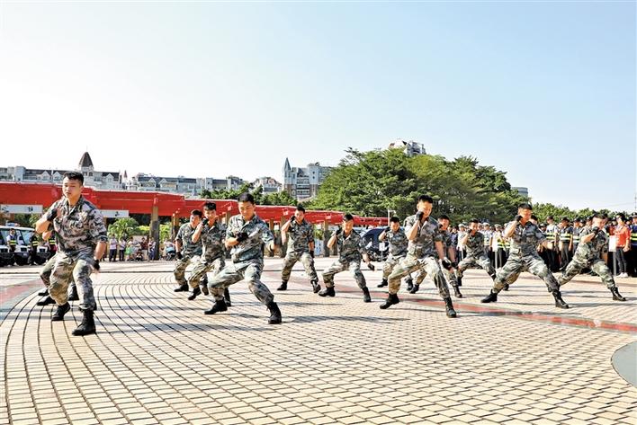 誓师大会上,义警队员英姿飒爽展示擒敌拳。