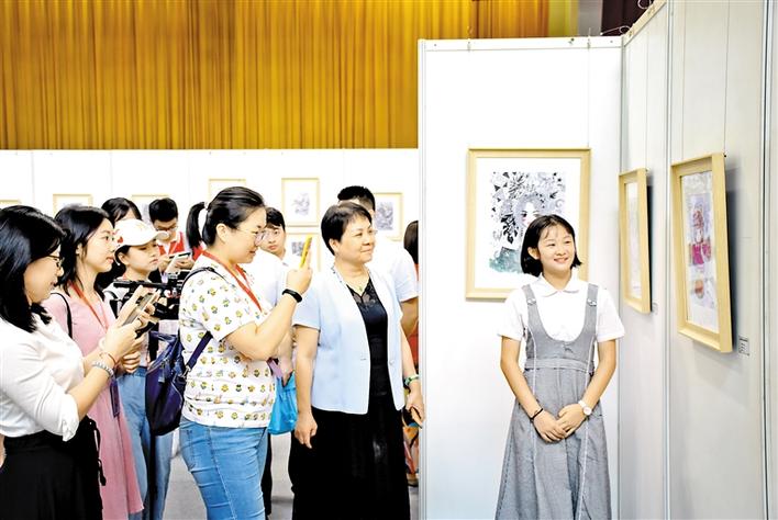 随后,学生代表带着记者们来到体育馆,参观了“月月有节日”之美术节作品展。整个展厅陈列着几百件学生们创作的艺术作品,包括书法、国画、版画、剪纸、手工制作、黏土、扎染等,展现了区教科院附属学校素质教育的累累硕果。