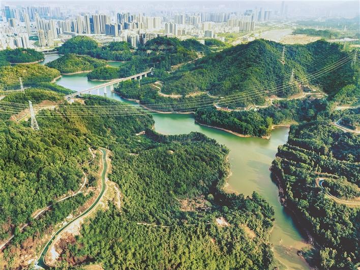龙华区环城绿道规划全长135公里,全线犹如一条“翡翠项链”,串起“山林城湖”。图为环城绿道羊台山段。
