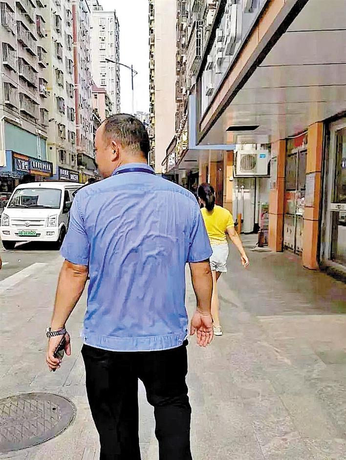宋占松在高温天气下走街串巷,汗水湿透制服。