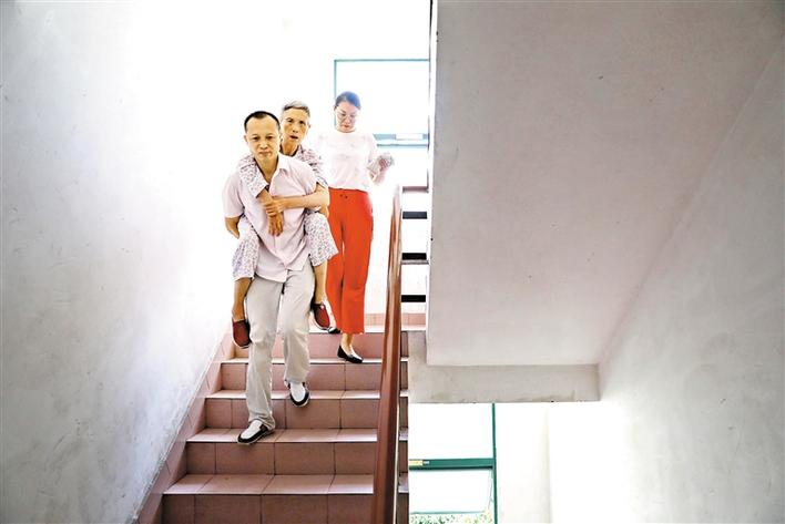 对于家住民治街道馨园小区的廖良勇来说,让家中70岁的母亲高美玉晒到阳光是件“不容易”的事。从去年4月至今,近1000次上下楼,超过7万个台阶……廖良勇背着瘫痪的母亲,妻子黄金晖在后方托住婆婆身体,每一步都走得小心翼翼。每个有阳光的日子,他们都坚持下楼,让生活已经不能自理的母亲晒到阳光,呼吸新鲜空气。