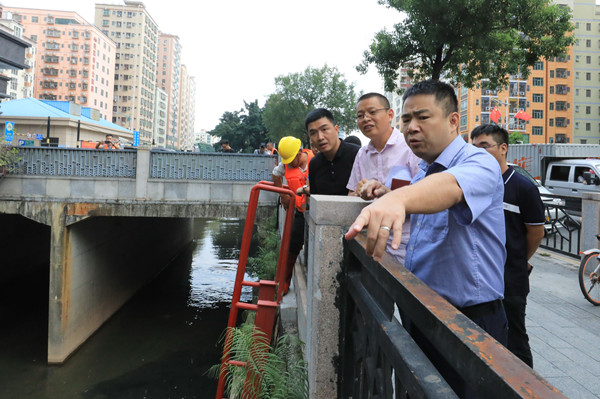 民治街道党工委书记陈龙兴深入基层(前排右一),带头破解社区治理难题。