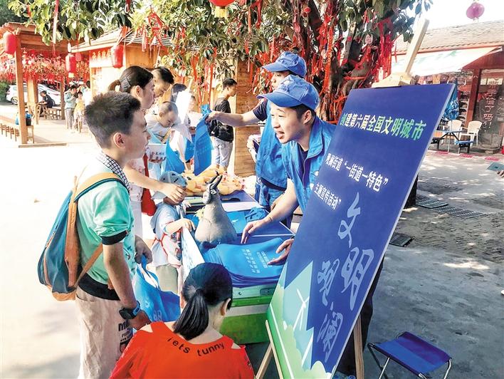 文明指导员在景区向市民宣传创文。记者 蔡维泽 摄