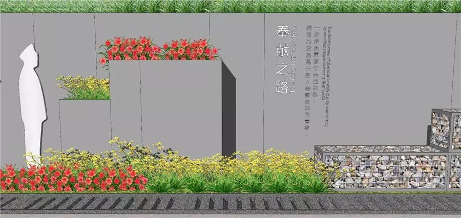 奉献之路主题景点以奉献精神为主旨,通过镜面剪影、沿途镶嵌的脚印、手印等方式展现,寓意着每一个在平凡岗位奉献的人都应该被铭记。