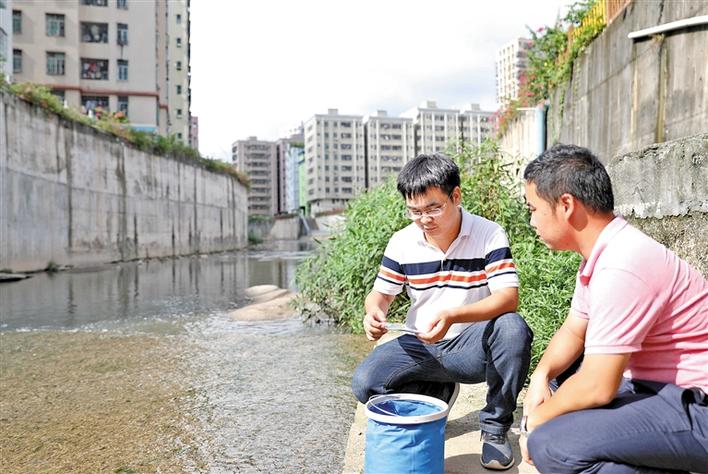 邓佑锋(左)在油松河暗涵出入口检查水质。