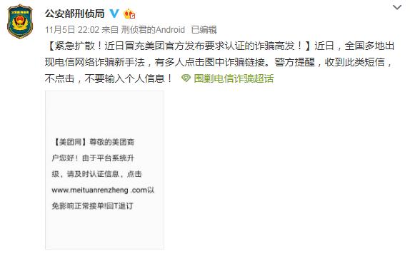 2019.11.12•周二嗨,我是平安君今天,我依然和你一起守护平安龙华公安部紧急预警。这个链接千万别点。全国多地出现电信网络诈骗新手法11月5日,公安部刑侦局发布预警近日,有犯罪分子冒充美团官方平台发送要求商户认证的短信,内含钓鱼网站链接,诱导商户输入身份证号、银行卡号、手机号、验证码等信息从而对商户银行卡进行盗刷,造成经济损失