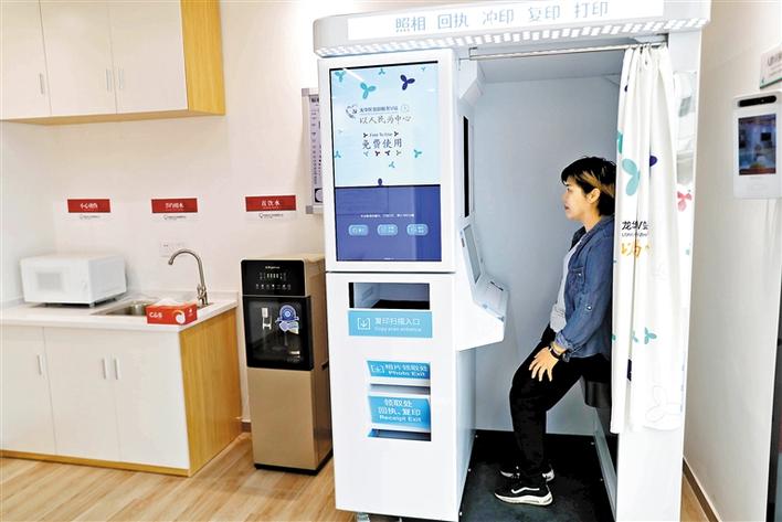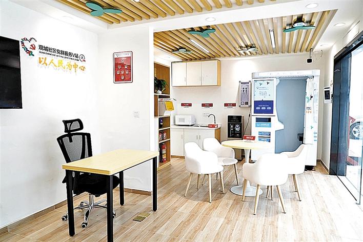 据了解,大和党群服务V站总面积31.1平方米。V站以AI人工智慧管理系统为设计核心,通过人脸识别监控系统及互联网数字监控管理,实现党群服务V站的智慧管理。小小的党群服务V站,容纳了20余项社区便民服务。“党建百宝箱”,党员可以免费领取党旗、党徽、党章、组织生活记录本等用品,随时随地就近开展组织生活;水电表安装申请、小额零星工程申报等事项,居民只需备齐办理业务相关资料,放入指定箱中,社区党委派专人开箱代办,限期三天内办结,实现线下不见面审批;共享雨伞、简易医疗、图书阅览、自助拍照复印、充电宝、缝纫机、工具箱等设施设备供群众24小时自助使用。