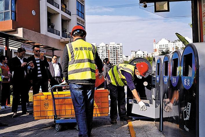 “滴……”昨日,装载各类生活垃圾的收运车鸣笛后有序驶出文澜苑小区。应邀而来的区人大代表、政协委员、小区物业人员、居民、师生等社会各界人士现场见证收运车辆在该小区完成各类垃圾分类收集以及装车发车全过程。