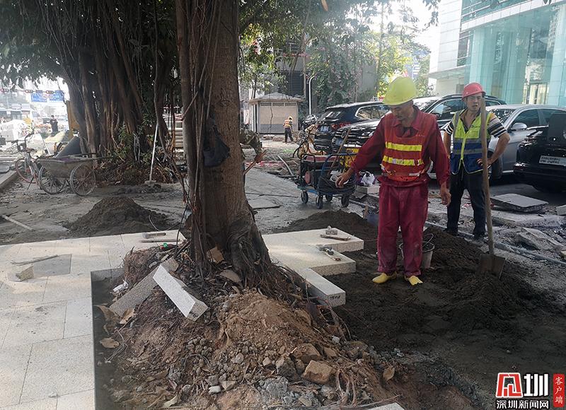上午10点,深圳市交通运输局执法人员来到福田区民田路与福华路路口的一处施工现场。记者在现场看到,沿着福华路一侧的人行道基本全部被挖开,建筑工人正在进行人行道石砖的铺设工作,由于施工围挡布置不规范,现场也没有完善的路线指引,不少市民出行受阻。